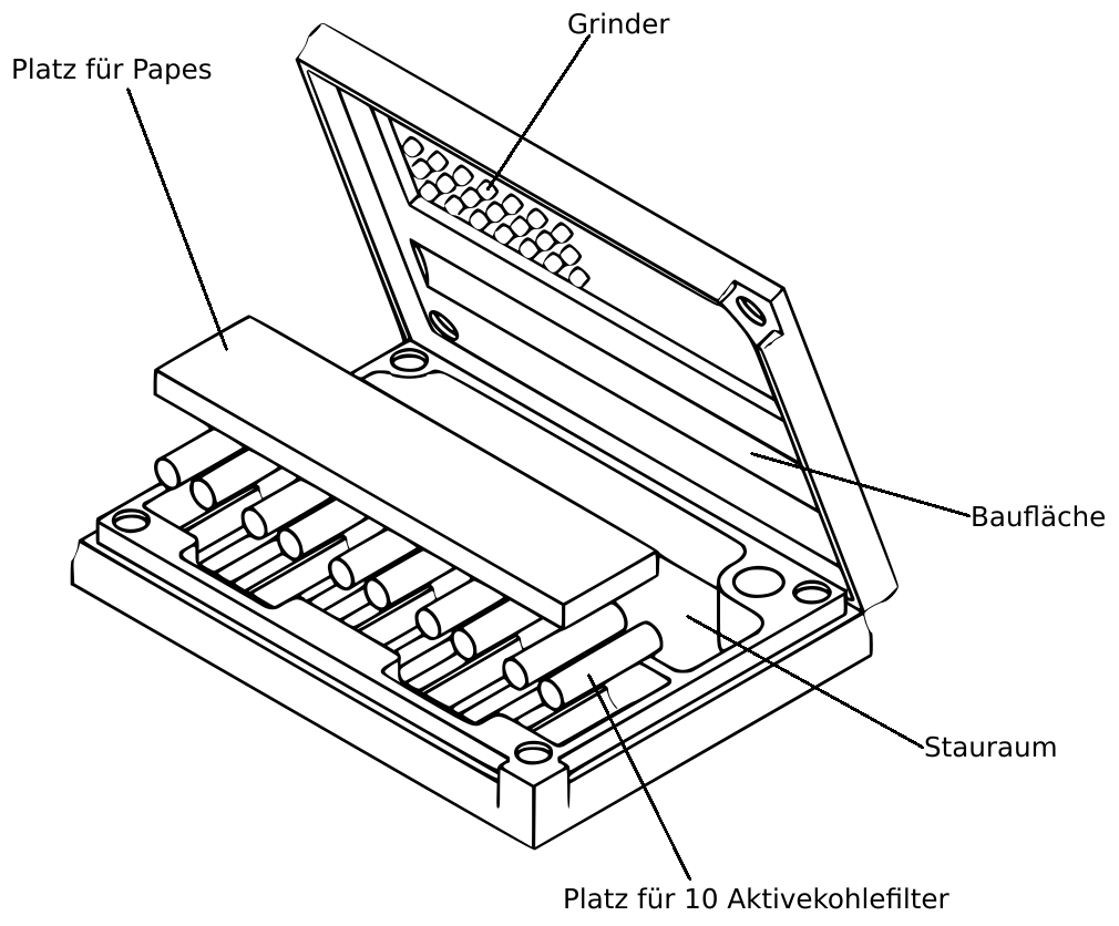 Sicherlich kennen viele das Problem: Man möchte unterwegs schnell und unkompliziert einen Joint drehen, aber es tauchen immer wieder Schwierigkeiten auf. Wo ist der Grinder? Wo finde ich eine ebene Fläche? Und wo habe ich jetzt schon wieder die Aktivkohlefilter verlegt? Damit ist jetzt Schluss. Unser Produkt bietet ausreichend Platz für 10 Aktivkohlefilter, Papers, Feuerzeug, Weed, Tabak, Grinder und eine bequeme Fläche zum Bauen. Zusätzlich sind alle unsere Produkte auch in einer Variante für Tipps erhältlich. So ist für jeden Geschmack etwas Passendes dabei.
